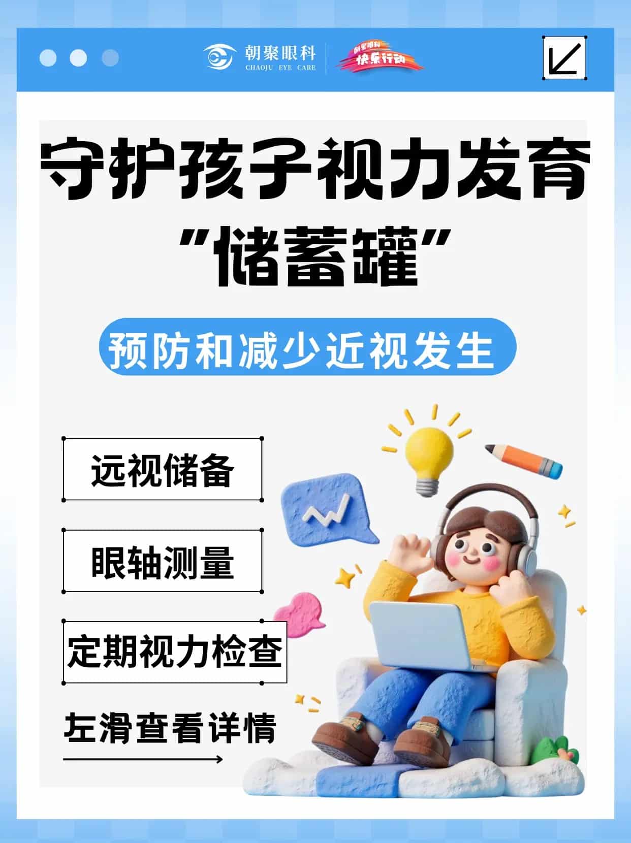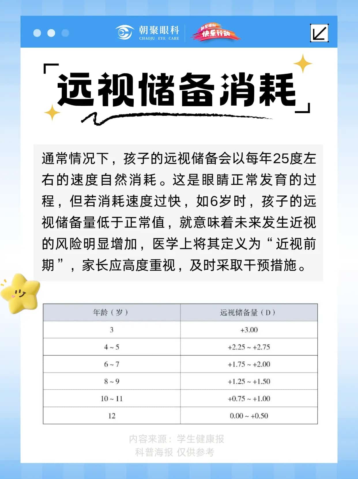 远视储备,是孩子眼睛的“防近视盾牌”。若过度消耗,近视风险将大幅提升。核心警报:⚠️ 6岁远视储备 < +1.75D⚠️ 眼轴年增长 > 0.18mm (6-12岁)防控关键:定期测量眼轴,建立屈光档案。建议从3岁起,每3-6个月检查一次,精准追踪视力发育趋势,及时干预。