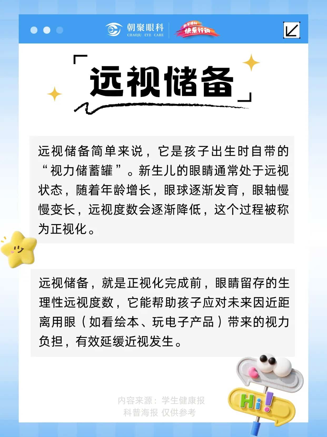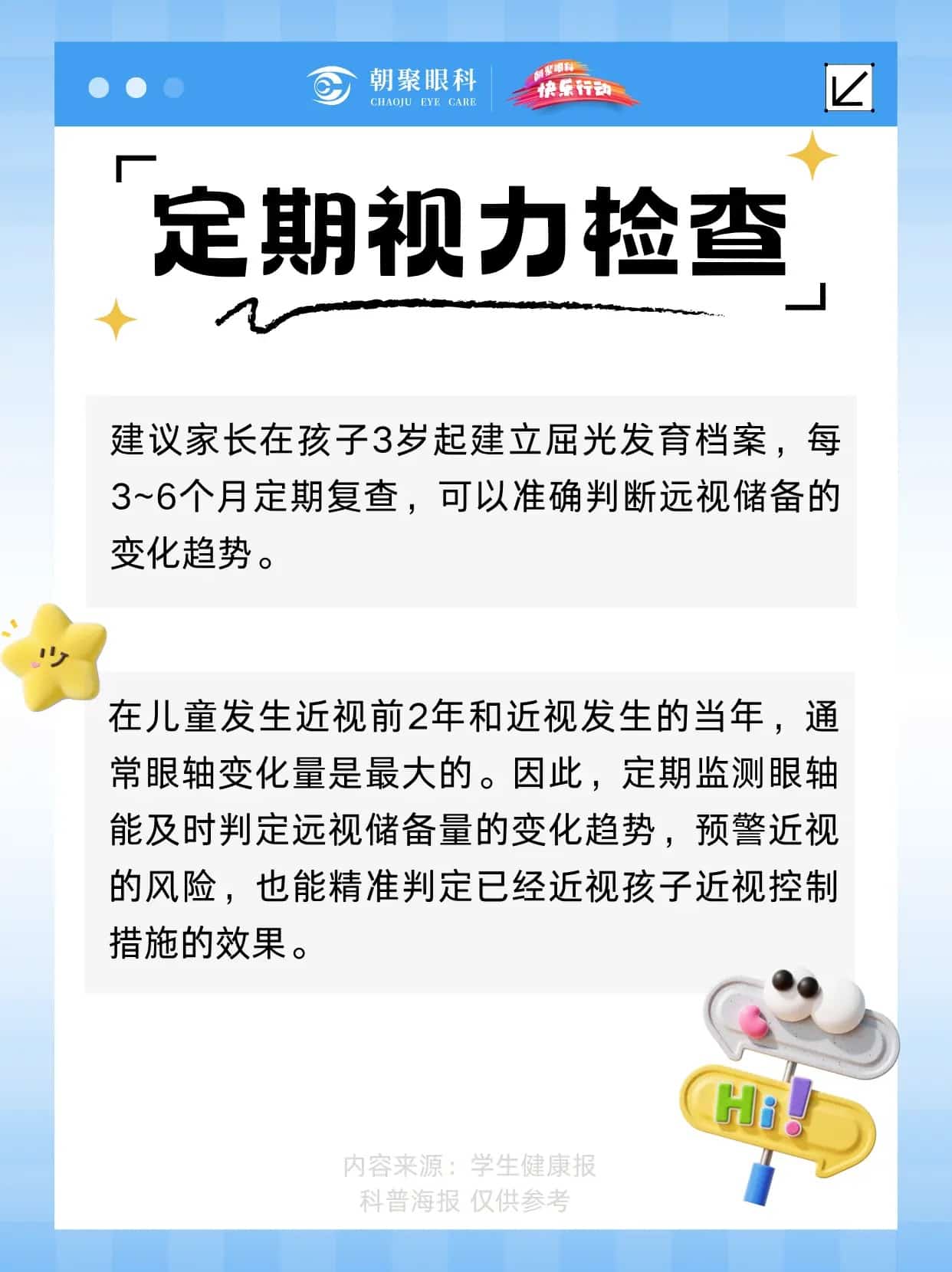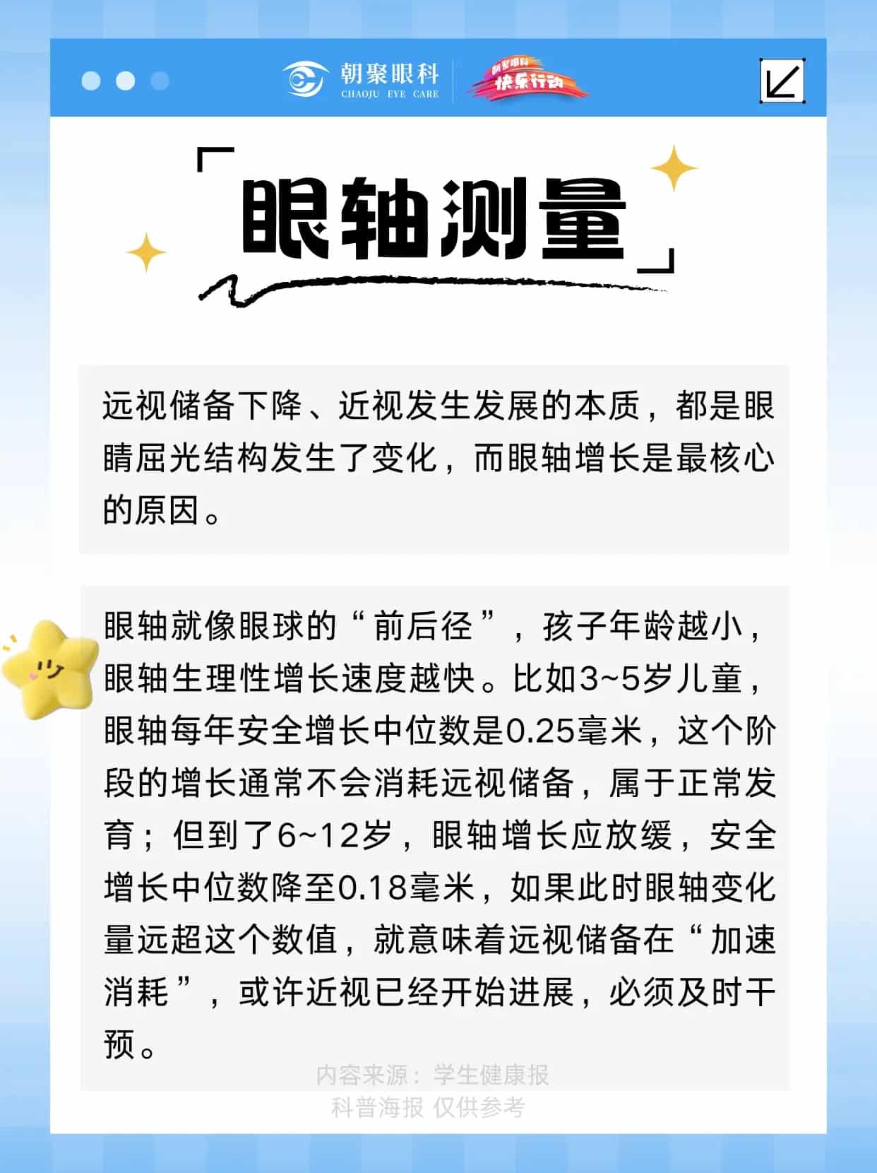 远视储备,是孩子眼睛的“防近视盾牌”。若过度消耗,近视风险将大幅提升。核心警报:⚠️ 6岁远视储备 < +1.75D⚠️ 眼轴年增长 > 0.18mm (6-12岁)防控关键:定期测量眼轴,建立屈光档案。建议从3岁起,每3-6个月检查一次,精准追踪视力发育趋势,及时干预。